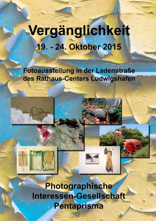 Das eigentlich Charakteristische dieser Welt ist ihre Vergänglichkeit. Nichts ist von Dauer. Wechsel, Veränderung, Entstehen und Vergehen sind wesentliche Merkmale aller organischen, anorganischen, lebendigen und nicht lebendigen Daseinsformen. Die Photographische Interessen-Gesellschaft Pentaprisma (PIGP) aus Ludwigshafen hat sich in ihrer diesjährigen Ausstellung mit dem tiefgründigen Thema der „Vergänglichkeit“ fotografisch auseinandergesetzt und präsentiert nun erstmalig in der Woche vom 19.10. bis 24.10.2015 ihre Ergebnisse in der Ladenstraße des Rathaus-Centers.