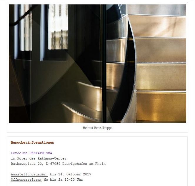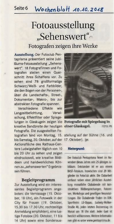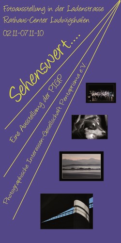 Nach dem Erfolg der letztjährigen Ausstellung “Licht und Schatten” präsentiert auch dieses Jahr die Photographische Interessen-Gesellschaft Pentaprisma (PIGP) ihre neuesten fotografischen Werke im Rathaus-Center Ludwigshafen. Die unter dem Titel “Sehenswert” dargebotenen rund 60 großformatigen Schwarzweiß- und Farbaufnahmen der 12-köpfigen Fotogruppe repräsentiert einen Querschnitt der unterschiedlichsten fotografischen Interessen der einzelnen Clubmitglieder.