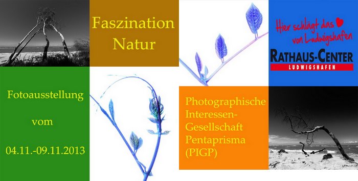 Auch in diesem Jahr präsentiert die in Ludwigshafen ansässige 14-köpfige Fotogruppe der Photographischen Interessen-Gesellschaft Pentaprisma (PIGP) in der Zeit vom 02.11.2012 -10.11.2012 ihre aktuellsten fotografischen Werke in der Ladenzone des Rathaus-Centers. Unter dem Titel “Sehenswert 2012” werden mehr als 60 großformatige Schwarzweiß- und Farbaufnahmen dargeboten, welche einen repräsentativen Querschnitt des unterschiedlichen fotografischen Schaffens der einzelnen Clubmitglieder widerspiegeln.