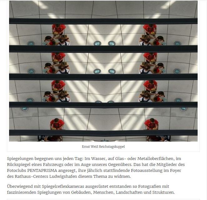 Ludwigshafen."Spiegelungen zu fotografieren, hat seinen besonderen Reiz", sagt Emil Kepert, künstlerischer Leiter des Fotoclubs Pentaprisma Ludwigshafen. "Die Bilder wirken auf unsere Augen immer speziell. Vor allem, wenn nicht gleich sichtbar ist, was gespiegelt ist." Ein guter Grund also, die diesjährige Ausstellung des Fotoclubs unter das Motto Spiegelungen zu stellen. Zwei Jahre hatten die Fotografen Zeit, ihre Werke zu erstellen. Bei der Vernissage am Montagabend lockten die 20 Hobbyfotografen viele Interessierte ins Rathaus-Center. Noch bis Samstag können die 60 Fotografien dort betrachtet werden.