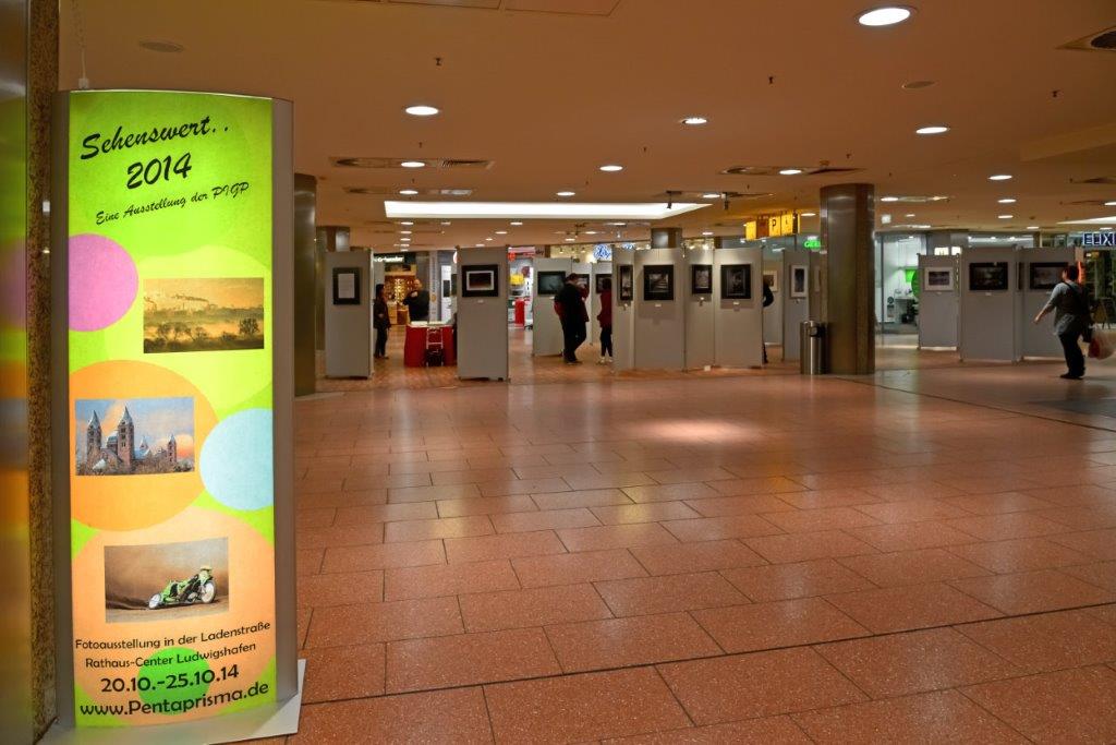 Im Rahmen des 35-jährigen Jubiläums des Rathaus-Centers präsentierte auch die Ludwigshafener Fotogruppe der Photographischen Interessen-Gesellschaft Pentaprisma (PIGP) in der Zeit vom 20.10.2014 – 25.10.2014 ihre aktuellen fotografischen Werke in der Ladenzone des Hauses. Unter dem Titel „Sehenswert 2014“ wurden 66 großformatige Schwarzweiß- und Farbaufnahmen ausgestellt, die einen repräsentativen Querschnitt des fotografischen Schaffens der 18 Clubmitglieder vermitteln.